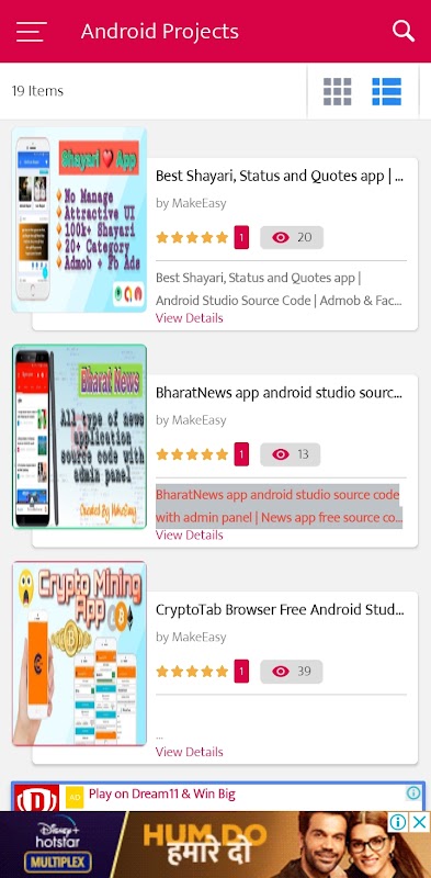 在這裡您可以找到各種類型的 Android Studio 項目源代碼和 Kodular (Online App Builder) AIA 項目源代碼,您可以使用它們來學習和創建自己的項目。您只需單擊即可獲取它,導入該項目並用作您的項目。