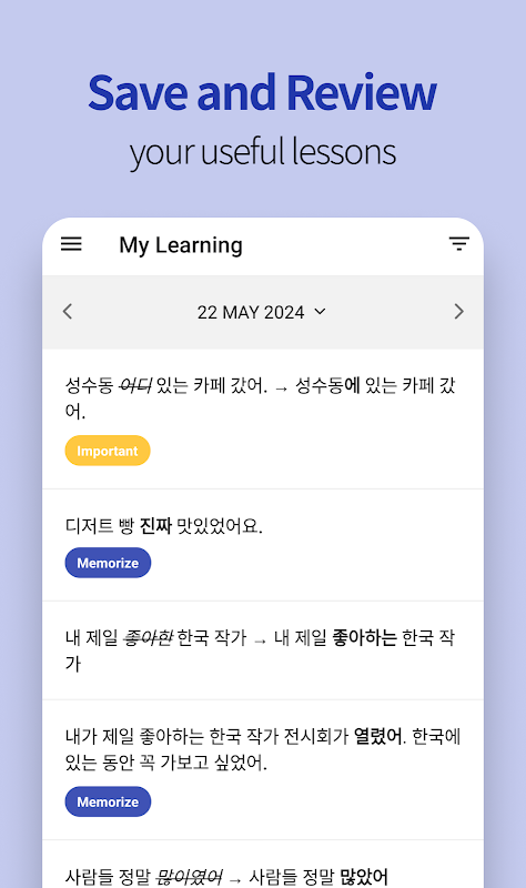 - 修正您使用的尷尬表達方式。保存並複習有用的課程。