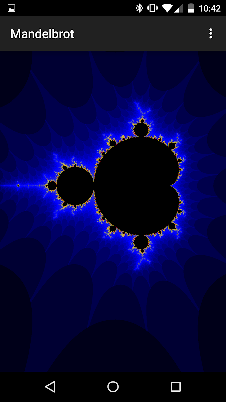 一個應用程序來計算和顯示Mandelbrot集。您可以通過觸摸屏幕擴展集。按菜單按鈕,您可以使用一些功能,如顏色的變化和放大速度和圖像保存。