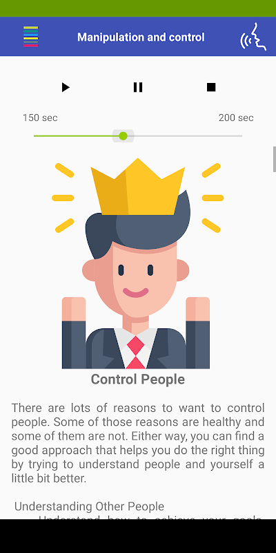 Manipulation and Control 是一款綜合性 Android 應用程序,它通過實用技巧和技巧向讀者傳授說服和影響的藝術。無論您是想提高工作場所、社交互動還是人際關係中的溝通技巧,此應用程序都提供了一系列工具來幫助您取得成功。從肢體語言和口頭交流到心理觸發因素和其他操縱技巧,您將學習如何在任何情況下佔據上風。通過掌握此應用程序中介紹的技巧,您可以增強有效說服和影響他人的能力。立即下載《操縱與控制》,自信地開始實現您的目標。