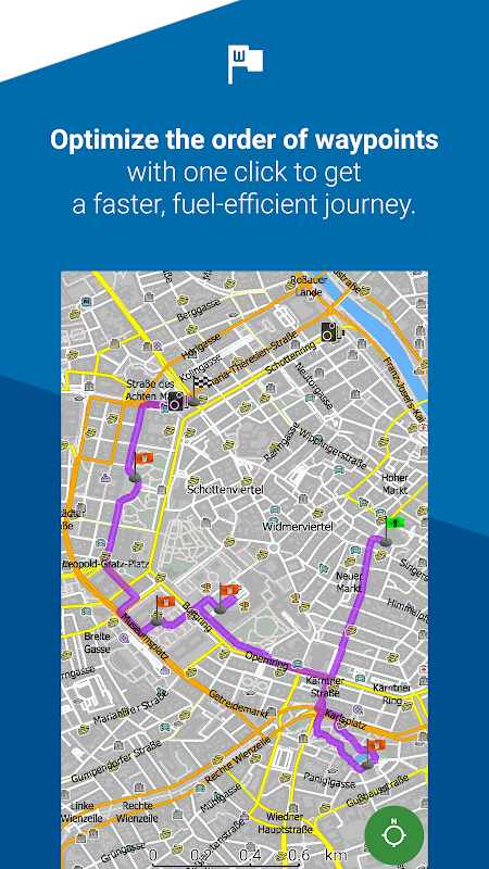 - 最佳化模式(最短、最快、最便宜)和單獨的道路限制(收費公路、收費公路、擁擠收費公路、渡輪)。