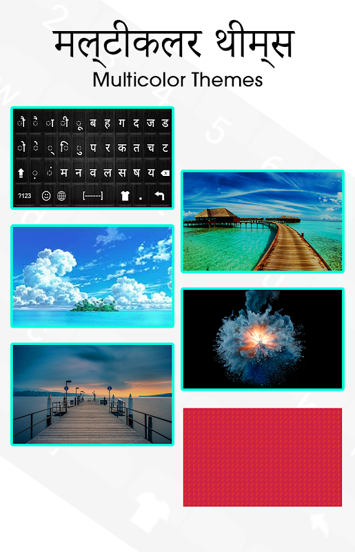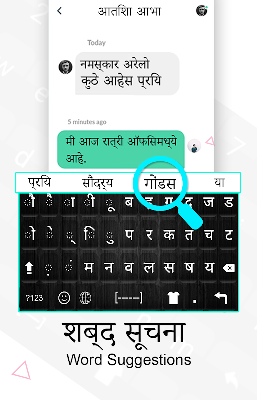 Marathi键盘壁纸非常适合手机键盘爱好者使用。在智能的Marathi语言键盘中享受快速,智能的英语Marathi打字。使用新的简单字体键盘以Marathi语言键入Marathi单词或Marathi消息。具有表情符号的Marathi软键盘是一款简单而丰富多彩的键盘,具有其独特的Marathi智能键盘功能。马拉地语和英语键盘都建议使用自动马拉地语单词预测功能,即使与计算机键盘相比,您也可以更快地进行回复。