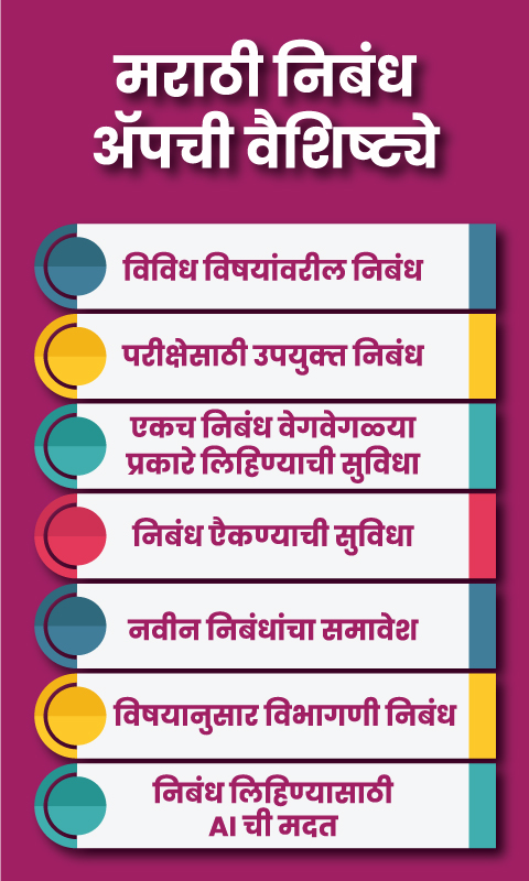 विविध विषयांवरिल निबंध : या ॲपमध्यि विषयांवरील मराठी निबंधांचा मोठा संग्रह आहे, जसे की चरित्रपर,不,不,不,不,不,不,不。