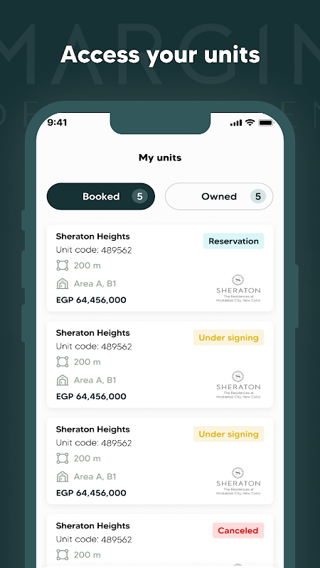 該應用程式還允許客戶查看他們在公司的完整歷史記錄,包括當前和取消的預訂,並追蹤預訂流程。他們可以訪問每個單元的詳細信息,例如最終價格、預訂日期、合約簽署日期、分期付款金額和到期日。客戶也可以上傳文件以確認分期付款或部分付款。