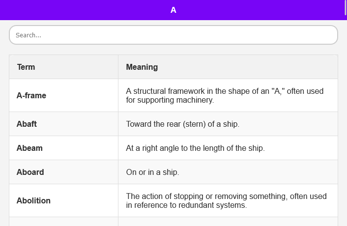 廣泛的 A-Z 術語表:探索精心組織的 A-Z 資料庫,其中包含 1000 多個海洋工程術語。每個條目都提供了清晰、簡潔的定義,確保您輕鬆理解最複雜的術語。