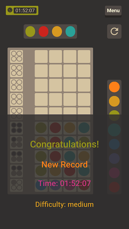 這是一款適合兩名玩家的經典代碼破解遊戲。一個播放器是代碼製作者,另一個是密碼破解者。在這個遊戲中,計算機是代碼製作者,你是代碼破解者。計算機將生成隨機顏色序列,您的目標是盡可能快地猜測秘密顏色序列。每當你把你的猜測放在電腦板上時,計算機會給你提示你的猜測,這將有助於你猜測秘密顏色代碼。這些提示將是:
