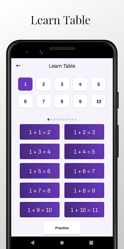 Learn Table: This section shows you sample questions and answers for addition, division and multiplication. After looking at them, you can answer the questions by pressing the practice button below. It is a great mode for those who want to learn beginner math without time constraints. The test continues even when you do wrong.