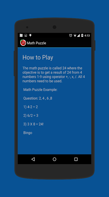 The math puzzle is called 24 where the objective is to get a result of 24 from 4 numbers 1-9 using operator +, -, x, /.