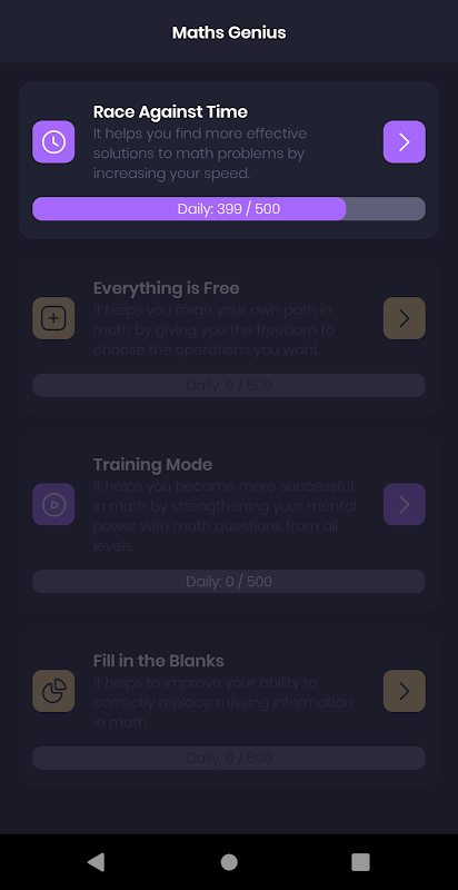 歡迎來到終極數學訓練體驗!我們的應用程式專為各個級別的學習者設計,提供了一個動態且引人入勝的平台來掌握數學技能。具有諸如用於快速思考的「與時間賽跑」、用於動態操作的「一切都是免費」、用於解決問題的「填空」以及用於持續改進的「訓練模式」等類別。