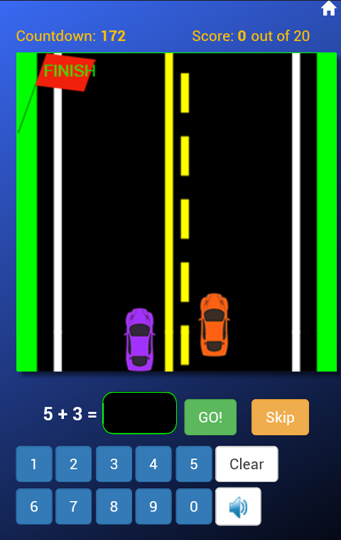This app features an addition activity which is a maths game that will help develop skills in addition using a car racing theme. Answer the addition problem correctly to move your car forward. Answer all 20 problems correctly within the set time period to win the race.