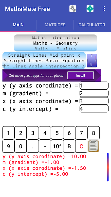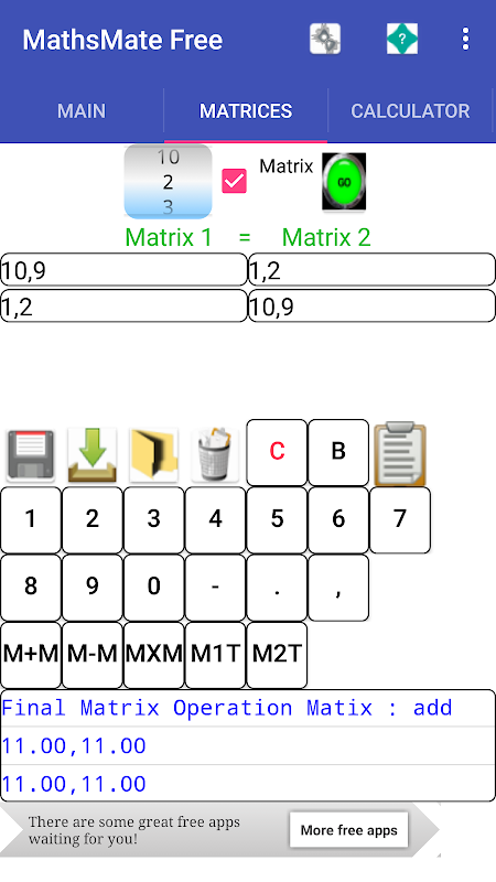MathsMate信息以及解決者免費提供一般的數學信息表以及一系列方程求解器/在幾何,靜力學,系列,比例長度,興趣,面積和體積的數學領域的計算。此外方陣之間的操作可以執行(乘法,加法,減法,移調)以及使用雅可比互為作用method.General設置線性方程組的求解,可以為程序和雅可比互為作用的方法進行。該應用程序很容易用一個標籤/滑動佈局設計中使用。在關於/幫助選項卡提供了一個簡單的Web瀏覽器。使用雅可比方法的線性解算器需要設置初始變量估計和interations的數量。在結果的顯示的誤差值也顯示旁邊的變量值。誤差是所顯示的和以前的變量值之間的差。通常較小誤差值的更準確的是結果。矩陣可以保存,發送電子郵件,下載到文件,並重新開放。