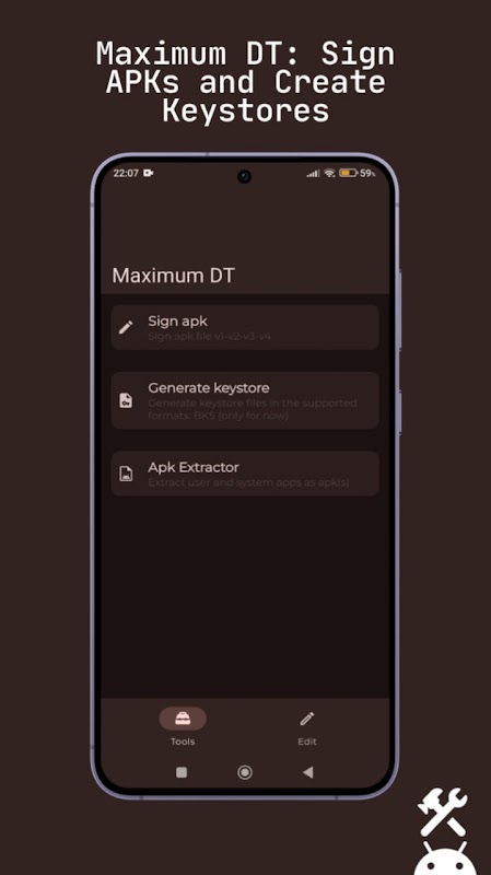 Maximum DT 是 Android 開發者的終極工具。使用Maximum DT,您可以簽署APK、創建BKS格式密鑰庫、提取應用程式信息,甚至將應用程式提取為APK或APKS格式。告別繁瑣的桌面工具 - 現在您可以直接從行動裝置處理所有 Android 開發工作。無論您是經驗豐富的開發人員還是剛起步的開發人員,Maximum DT 都能提供您簡化開發流程所需的一切。立即下載,將您的 Android 開發提升到新的水平