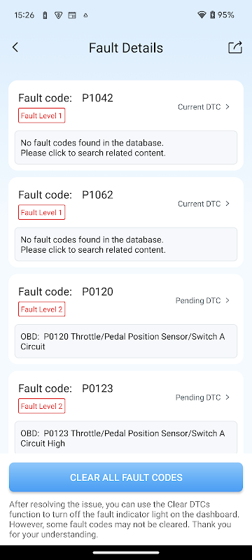 即時診斷:即時讀取並清除所有主要係統(引擎、變速箱、ABS 等)的故障碼 (DTC)。