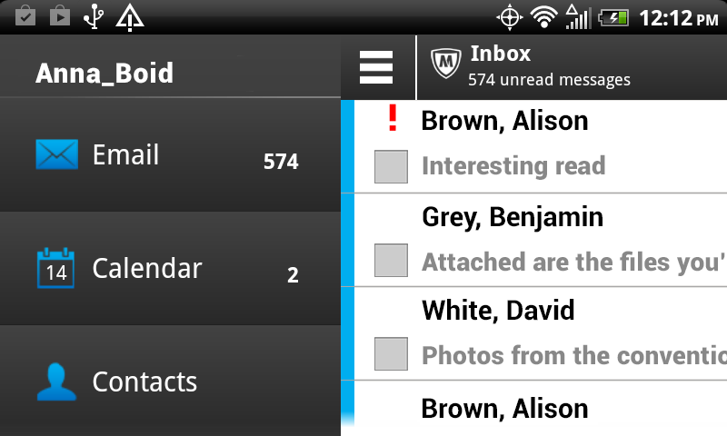 • 與公司的 Exchange 2003/2007/2010 伺服器或 Domino 8.5.2 伺服器同步業務電子郵件、連絡人及行事曆