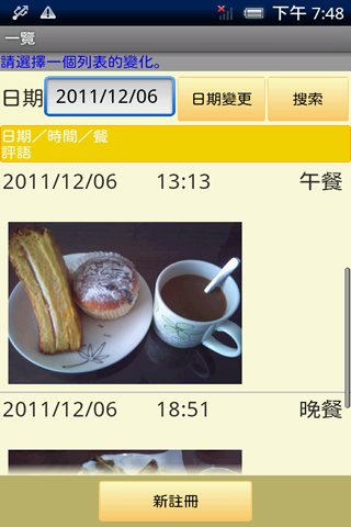 顯示您的膳食清單,從日曆中選擇一個日期。檢查飲食名單的詳細內容可以得到糾正。