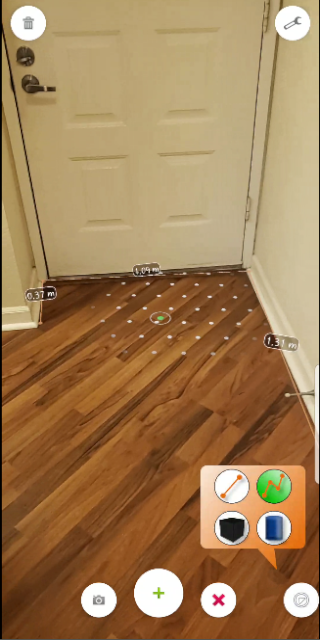 在空間中移動手機以找到平坦的表面,例如桌面或地板。指向並點擊以開始測量,然後按X按鈕停止測量。