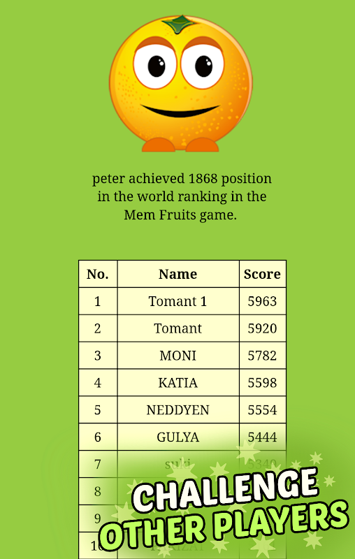 你的記憶力和專注力有多好?您想玩能改善您的記憶力,注意力和大腦能力的遊戲嗎? Mem Fruits是所有年齡段的配對遊戲-獨自玩耍或與您的孩子一起玩。規則很簡單:找到一對相同的動畫水果卡,擊敗您的得分(時間)記錄。找到卡對的速度越快,您就可以獲得越多的積分。我們的遊戲與其他此類游戲的區別是圖形(遊戲中出現的每個圖像都是動畫的)和聲音效果-我們真的鼓勵您打開聲音。為了方便起見,默認情況下聲音是關閉的-您可以在無聊的演講或會議中安全地玩我們的遊戲。找到一對水果以提高您的記憶力和注意力!