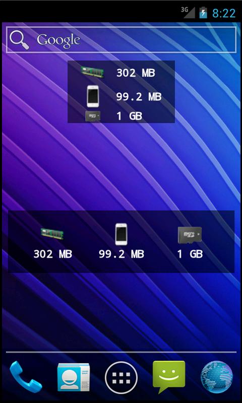 Shows free memory(ram), free internal space and free external(sd card) space.