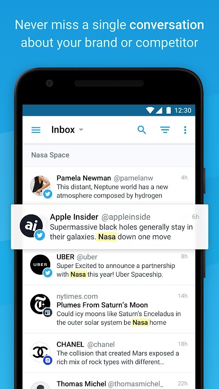 - Smart actions: Connect your social accounts and react to any mention the smart way. Retweet a tweet that mentions you, share on facebook any positive article about your company