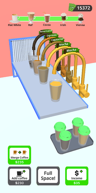 使用新的咖啡機改善您的咖啡店。裝滿拿鐵、摩卡、美式、濃縮咖啡等咖啡,賣給顧客。單擊機器並加快咖啡灌裝速度!
