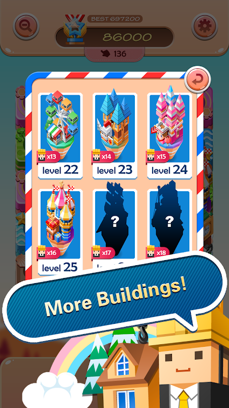 🏡-合成越多的高級建築,你獲得的分數也會越高!