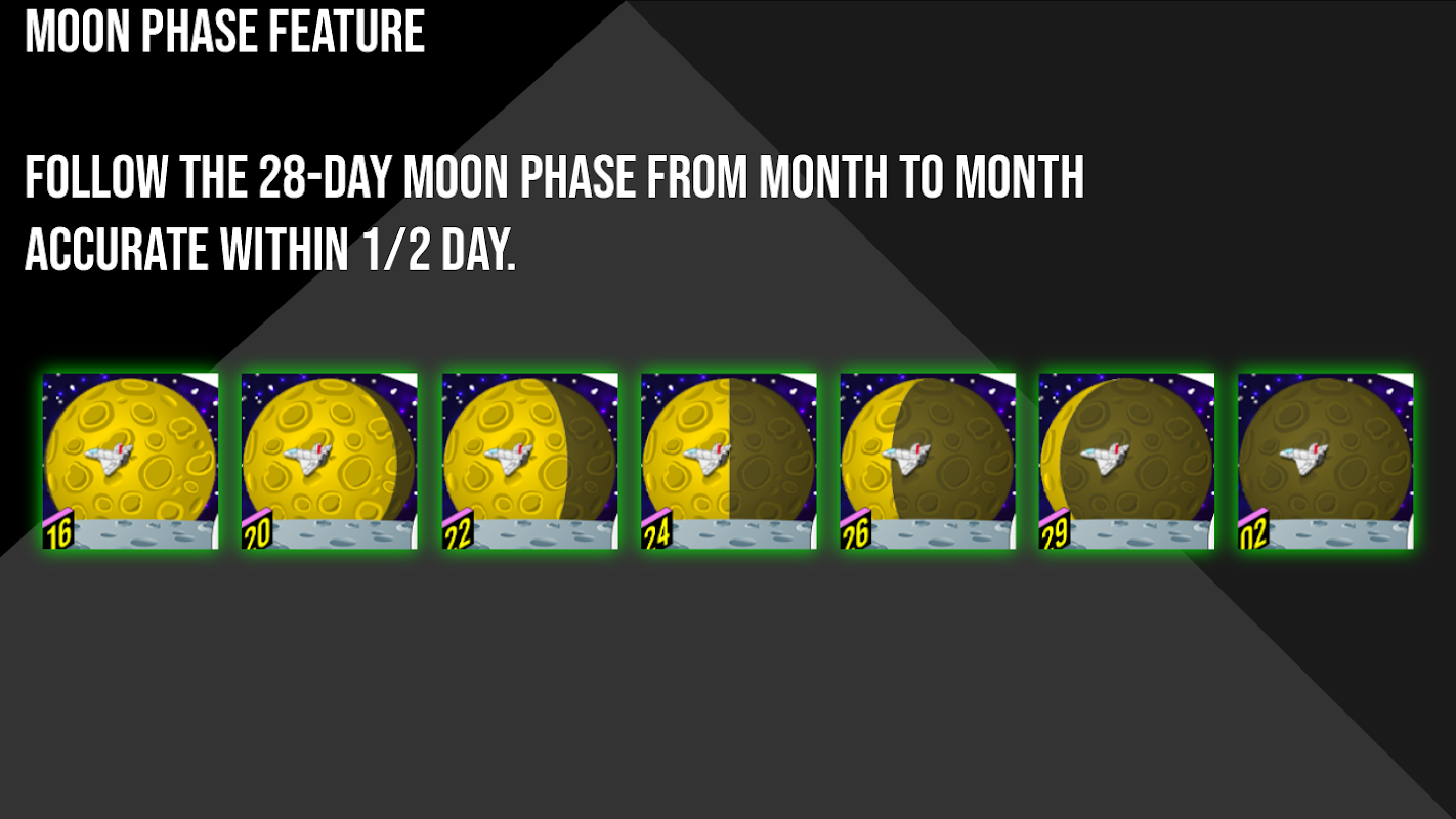- 真實的 28 天月相圖形顯示在背景中的大月亮上,精確度在 +/- 半天內。隨著月份的推移,留意它的每日變化!