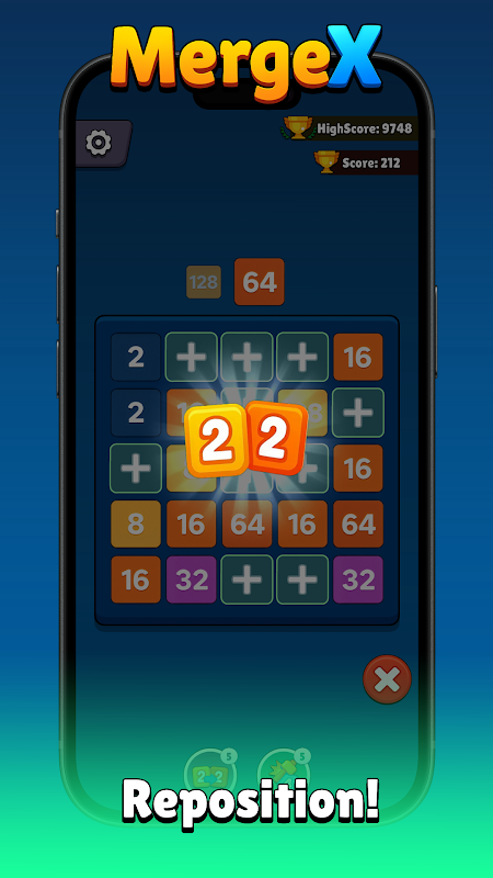 在 MergeX 中,你可以在放置數字之前隨時查看當前數字和下一個數字,這有助於你制定更明智的策略。用手指按住一個數字,將其分成更小的部分並放置在棋盤上。連續合併三個相同的數字,將它們組合起來,看著結果翻倍,創造新的可能性。