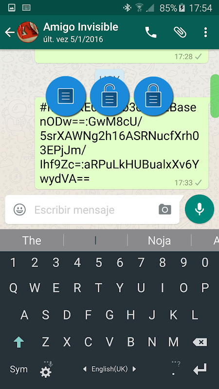 This App can help you to cipher your whatsapp messages using several keys. When you are in WA you will see a red/green zone at upper right screen. If the zone is red then you will have to enter your PIN code in order this App to work, but if it is green you will see 3 bubbles on your screen.