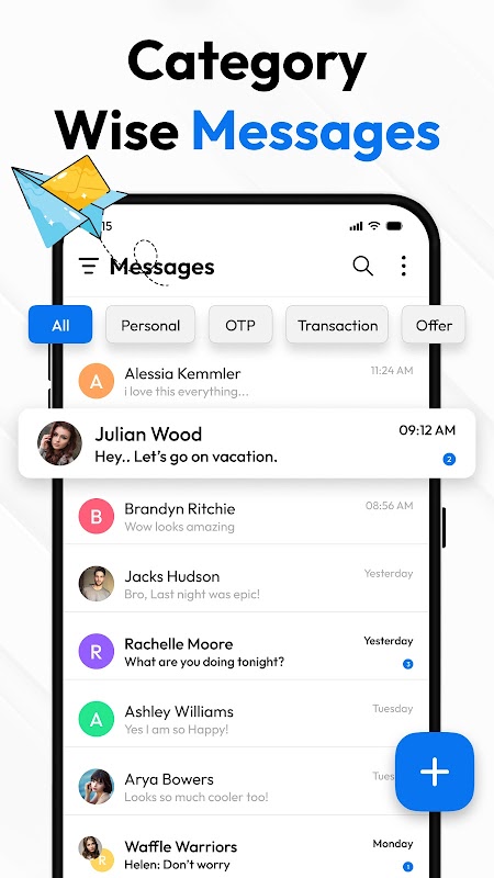 获取 Messages Text SMS 应用,体验更智能的短信服务,包括定时发送、垃圾邮件拦截、快速回复和 OTP 复制等强大功能。