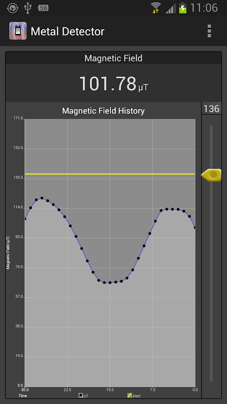The metal/magnetic field detector may require you to move your device close to the magnetic source (10-15cm) before a reading can be done.