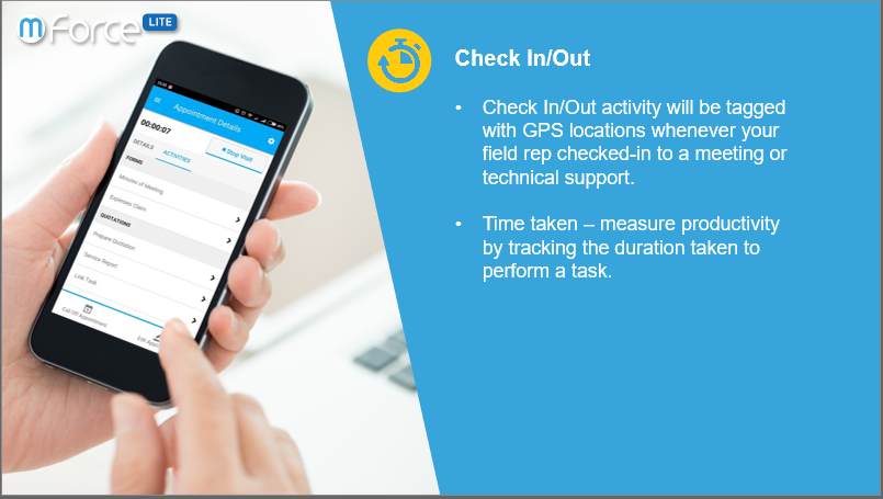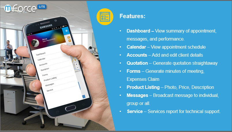 mForce-LITE授權現場代表來管理他們的業務約會,很容易地檢索編碼的客戶信息和預約歷史,執行和監控他們的活動和進展,並完成他們的報告,如創建會議記錄和備案費用通過他們的手機聲稱與按鈕只需點擊幾下。