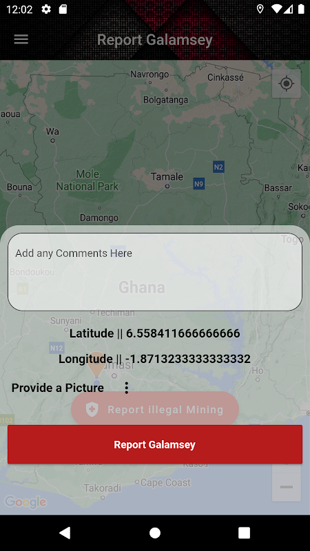 該應用程序易於使用,可以從任何地方訪問。無論您是當地居民、環保主義者還是關心此事的公民,您都可以使用我們的應用程序報告您遇到的任何非法採礦活動。通過報告這些事件,您可以幫助保護環境、保護自然資源並確保加納的採礦活動合法且可持續地進行。