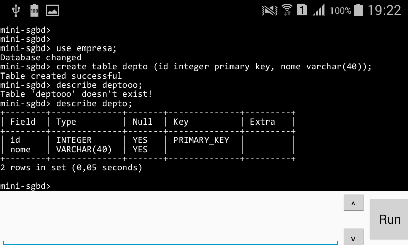 O MiniSGBD Run SQL (DBMS), é um aplicativo educativo para auxiliar o aprendizado da linguagem SQL. O app executa os comandos básicos de SQL por uma interface de linha de comando (Terminal), os comandos e querys são basicamente a primeira vista parecidos com o MySQL quando executados por linha de comando. Os dados são salvos e podem ser consultados, também possui uma lista de comandos anteriores executados. Segue a lista atualmente das operações possíveis.