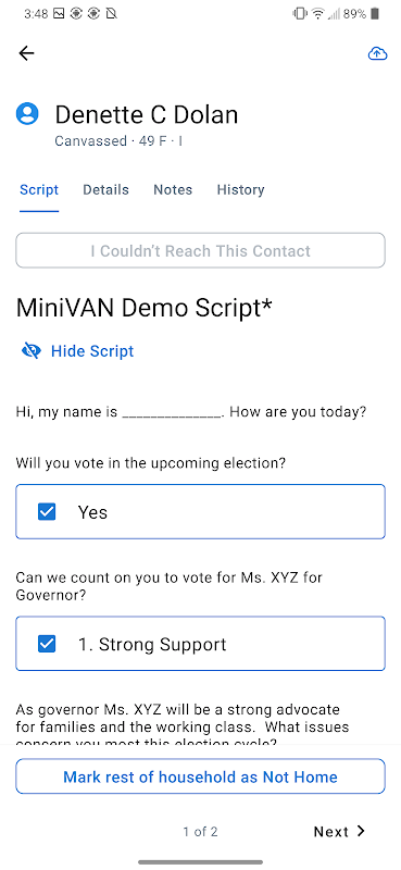 使用 miniVAN 進行拉票使 NGP VAN 客戶能夠花費更多的時間和資源來實際聯繫人們,而不是花在資料輸入上。 更重要的是,它幾乎消除了收集調查結果和將資料投入使用之間的延遲時間。
