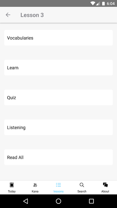 - 「學習」: 聽到讀音後,輸入相應的平假名,以更加互動和容易的方法學習每組字句。這個訓練有助加強聆聽、閱讀和寫作能力。功能設有不同學習模式,你可以順著每節課堂裡詞彙出現的次序來做測試,亦可以選擇隨機抽取詞彙。另外,你可以選擇在有提示之下做練習。