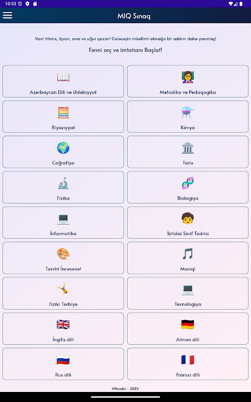 阿塞拜疆語言文學、數學、教育學、地理、歷史、物理、生物、化學、資訊學、外語、基礎教育、音樂、美術、科技、體育等等——MIQ Test 應用應有盡有。