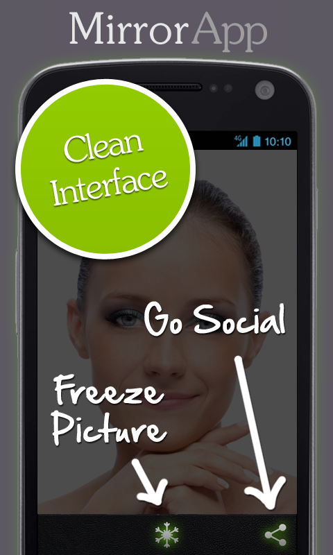 Mirror app for your phone and tablet! Using your front camera to check your look has never been so easy. Default camera application is complex and you have to press buttons and change settings to use front-facing camera. In contrast, with this mirror you do this with just one tap. Also you can freeze the picture, without the need of taking photo and going to the gallery.