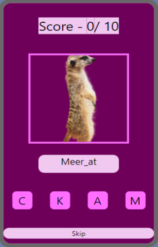 This is game app where you have to identify the animal name by looking at the picture given and choose the correct letter from option to fill the missing letter from name of animal. Each correct answer will give you 2 points. Have fun and enjoy the game.