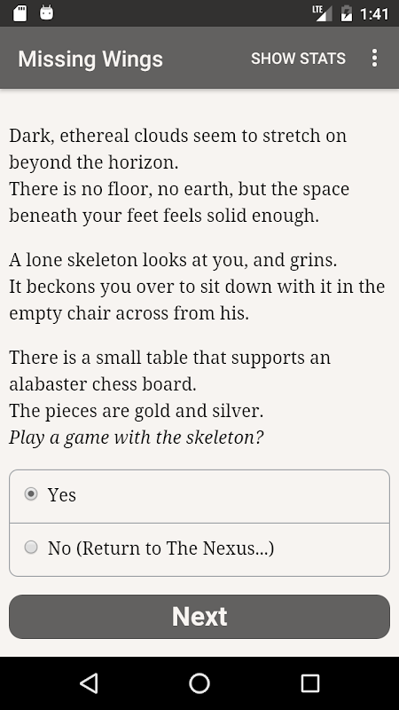“Missing Wings”是由Carlos H. Romero Jr.製作的一部14萬字的互動小說,你的選擇可以控制故事。它完全基於文本 - 沒有圖形或聲音效果 - 並且受到你想像力的巨大,不可阻擋的力量的推動。