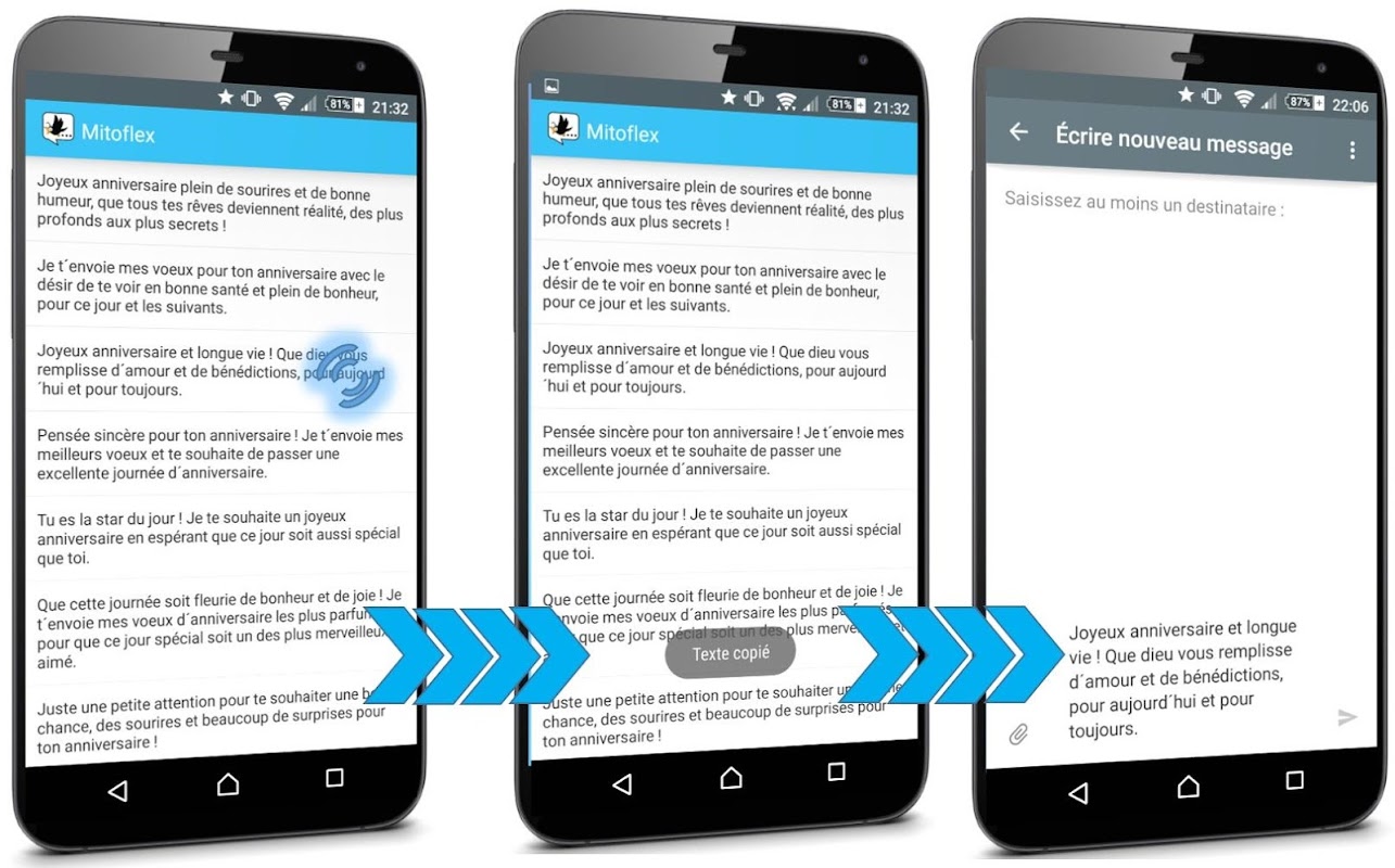 Ce n’est pas toujours facile de trouver l’inspiration, c’est pourquoi MitoFlex vous fait gagner du temps en vous proposant d’innombrables et différents messages sur un ton humoristique, décalé ou tout à fait sérieux. Profitez de la fonction de copié/collé pour insérer facilement les phrases/citations proposées dans vos applications de messageries préférées (Facebook, WhatsApp, Twitter, etc.) ou les envoyer par SMS.