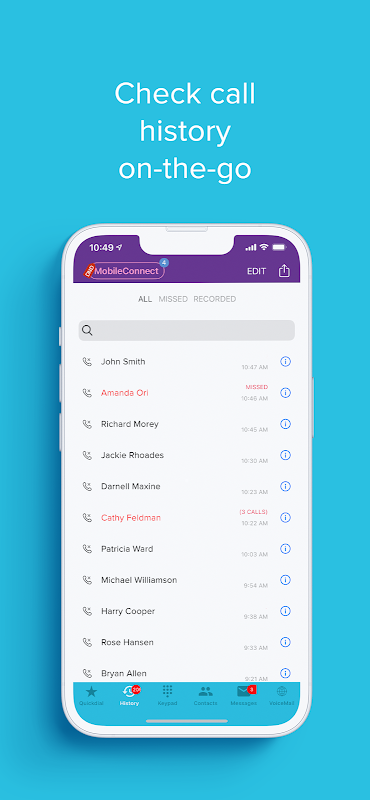MobileConnect 是一種 SIP 軟客戶端,可將 VoIP 功能擴展到固定電話或桌面之外。它將您的 MobileConnect 批准的專有云 pbx 的功能作為統一通信工具擴展到您的移動設備。借助 MobileConnect,用戶無論使用何種設備,在從任何位置撥打或接聽電話時都能夠保持相同的身份。 MobileConnect 使用戶能夠直接從他們的 Android 設備管理聯繫人、語音郵件和通話記錄。這還包括在線狀態或能夠直接從 MobileConnect 聯繫人頁面查看同事是否正在通話。