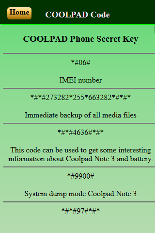 You can find the secret code of your COOLPAD Android mobile devices. In this app, there are various hidden codes given which can be working on the Android devices. COOLPAD mobile secret codes can also be used for obtain access to the secret portal of the Android services. After execute the secret code, your device might be affected. So keep backup your all data before execute any secret code. We will not be responsible for any damage of your mobile device. It is not official app of COOLPAD.
