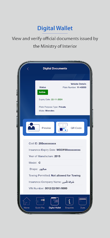 - 數位錢包:您可以正式出示和使用您的駕駛執照、車輛保險和警察事務ID。