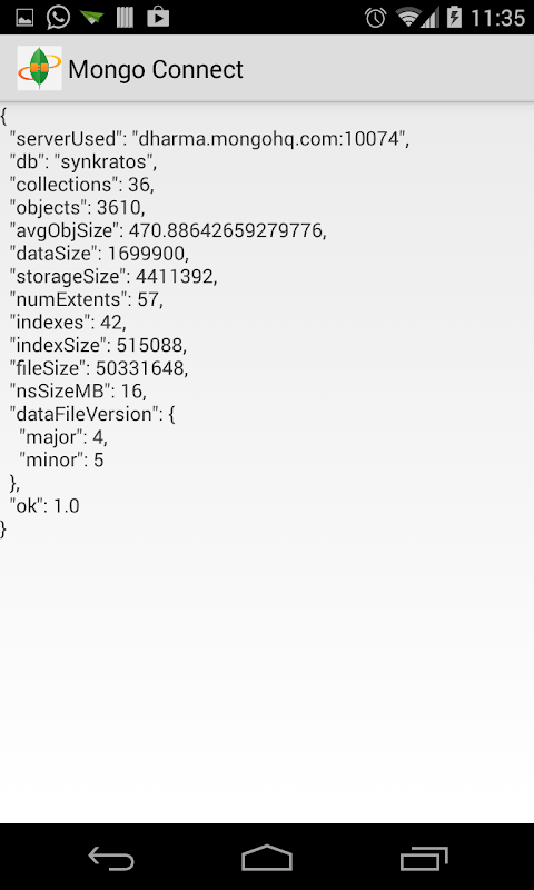 Mongo Connect is an easy-to-use app to test mongo DB's connections. You are up to configure all mongo connection's parameters and test connectivity with databases. Also you can view de DB stats and collections you have in database.
