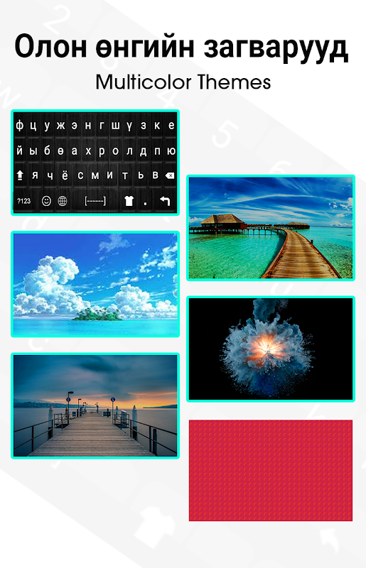 蒙古文键盘:蒙古文打字语言是多语言键盘,您可以从蒙古文的多种语言打字中输入蒙古字母和英文字母。带有主题的蒙古语键盘非常适合键入蒙古文和英文的键和软键。