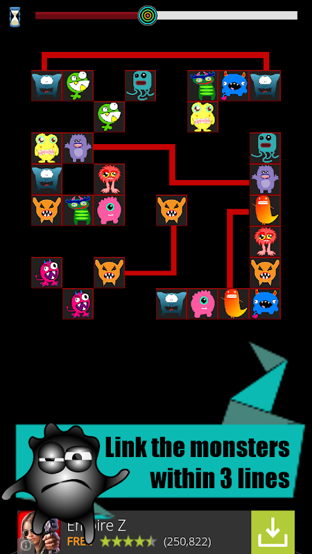 Simply match 2 identical monsters within 3 lines as shown in the example above - If you have made a correct match the monsters will be bashed away and removed from the board. Work fast and bash all of the monsters before the timer runs out and remember, if you get stuck you have 3 hints and 3 shuffles per game.