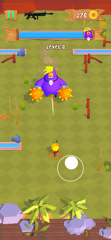 Shoot the monsters with every weapon that you find and defend yourself. Be careful, every monster splits into two smaller monsters once you defeat them.