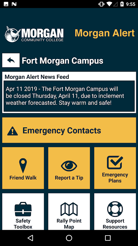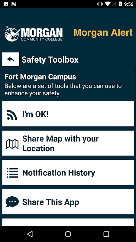 Morgan Alert is the official safety app of Morgan Community College. It is the only app that integrates with Morgan Community College's safety and security systems. Campus Security has worked to develop a unique app that provides students, faculty and staff with added safety on the Morgan Community College campus. The app will send you important safety alerts and provide instant access to campus safety resources.