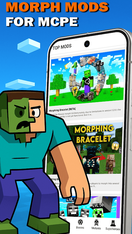 這款應用程式為您帶來精心挑選的 Minecraft PE 變形模組,讓您可以變身為遊戲中的生物甚至家具。使用這些變形模組,您可以變成殭屍、骷髏、爬行者,或變成椅子或床等靜態物體——就像您最喜歡的影片中一樣。使用變形模組和遊戲機制,玩家可以以全新的形態探索世界,並在生存中扮演不同的角色。