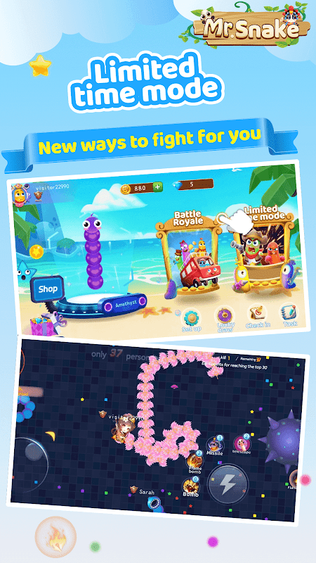 限時模式:在此模式下,您需要在有限的時間內盡可能地增加長度。你可以找到火砲物品並用它來攻擊其他玩家的身體來縮短他們的蛇。這種模式非常令人興奮,因為你需要在短時間內快速做出決定,同時避免撞到其他玩家。